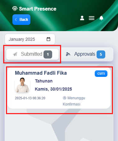 - Tap Submitted untuk memunculkan list pengajuan approval, lalu tap list nama karyawan yang mengajukan approval untuk menampilkan data pengajuan secara lengkap