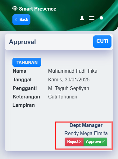 - Dari data pengajuan yang tampil anda bisa tap tombol Approve untuk setujui pengajuan atau Reject untuk batalkan pengajuan.