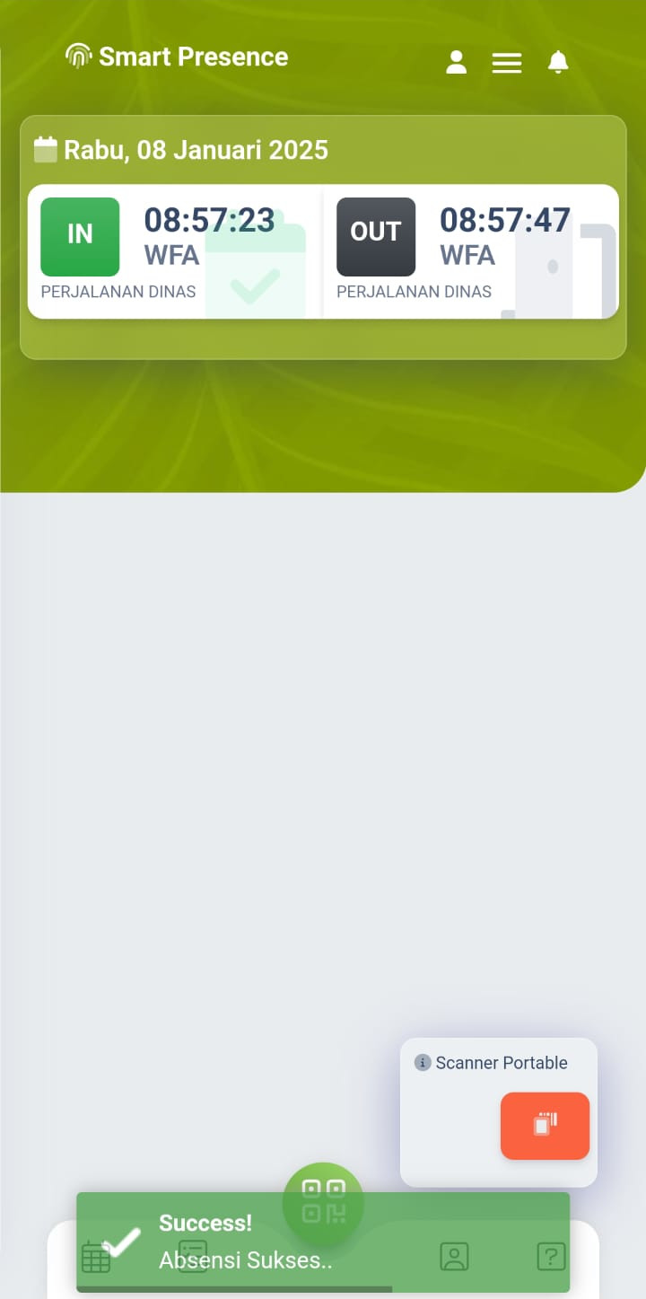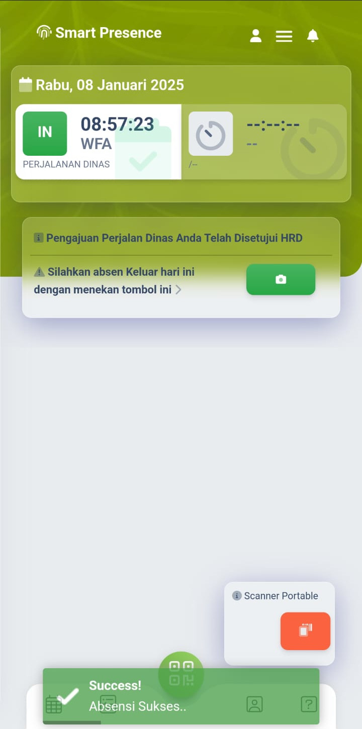 - Setelah perjalanan dinas disetujui HR, tombol absensi (kotak kuning) akan muncul di halaman utama aplikasi.